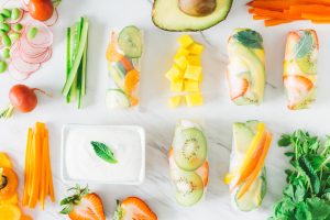 No one’s excited about cooking over a hot stove in August, so we’re guessing you’ve been eating a lot of your produce fresh. Here at the Creamery, our arms are overflowing with organic veggies each week from Creamery provided CSA Boxes delivered by Camas Swale Farm. It’s is a delicious problem to have! We love a good dip served with a variety of crisp-cut veggies, i.e., bell peppers in every color of the rainbow, adding folate and polyphenols to our late-summer lineup of important nutrients. As it happens, we’ve got a delicious idea for snacking in technicolor. Try filling translucent Rice Paper Rolls with a crunchy combination of fruits and vegetables, then serving them with a cool and creamy dip made with fresh mint and Nancy’s Organic 100% Grass-Fed Yogurt.