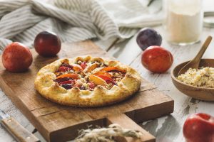 First, what’s a stone fruit? Simply put, it’s any fruit that has a pit or a “stone” in the center. Peaches, apricots, plums, cherries and (surprise!) even blackberries and figs are in this category and right now they’re ripening with sweet juices. Each type is loaded with nutrients, including potassium, vitamin A and vitamin C that may help to support healthy blood pressure and your immune system. If you’ve got a fresh-picked bucket of stone fruits, the law of summer says, at least a few must be eaten out-of-hand. The rest can be combined with Nancy’s and other wholesome ingredients to make sweet summer recipes, like a rustic plum-filled galette or a baked custard tart.